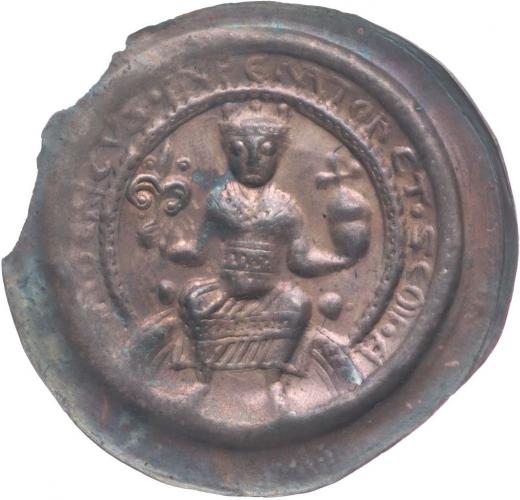 Brakteát b.l. z let 1180-1190, opis: FRIDERICVS.INPERATOR.ET.SEMP.A Sedící korunovaný císař s liliovým žezlem a dvojitým jablkem minc.Altenburg, 32 mm, Bonh.1171, Fd.Gotha.529 _dr.okraj starý podl.lístek RR!