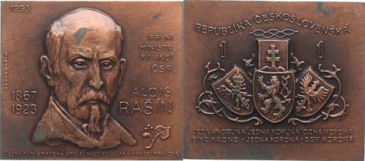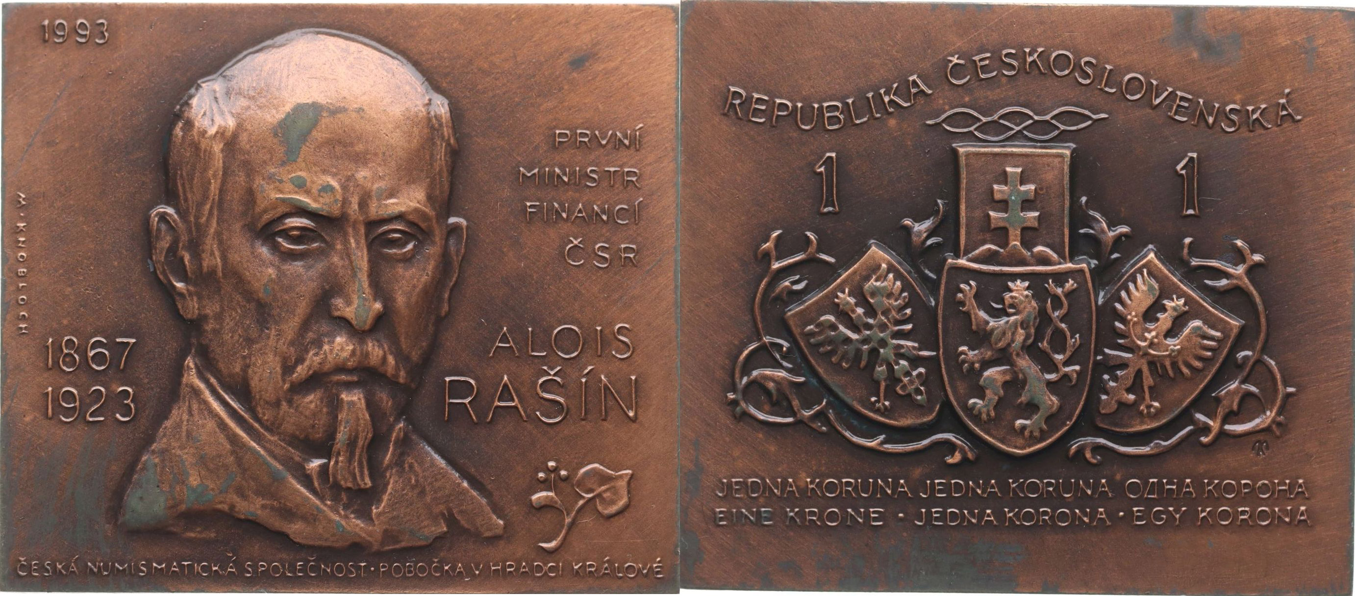 M.Knobloch - Alois Rašín, 1876 - 1923, 1993#Br Poprsí mírně zprava, nápis / faksimile 1 Koruny 1919, Sign., Bronz.plaketa 60x52 mm, FM.A10/17c