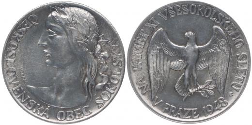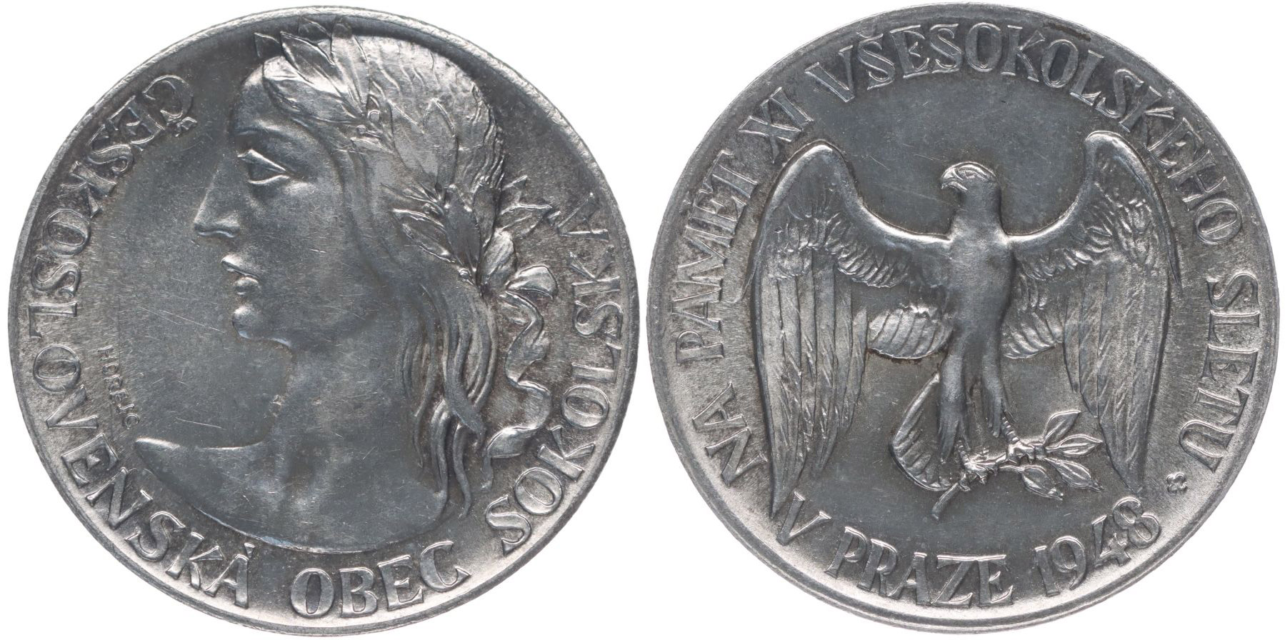 ČOS - Na paměť XI. všesokolského sletu v Praze 1948 Poprsí ženy zleva, opis / sokol s rozepjatými křídly, opis, Sign., Punc., Ag 500/1000, 28 mm, 13,6 g