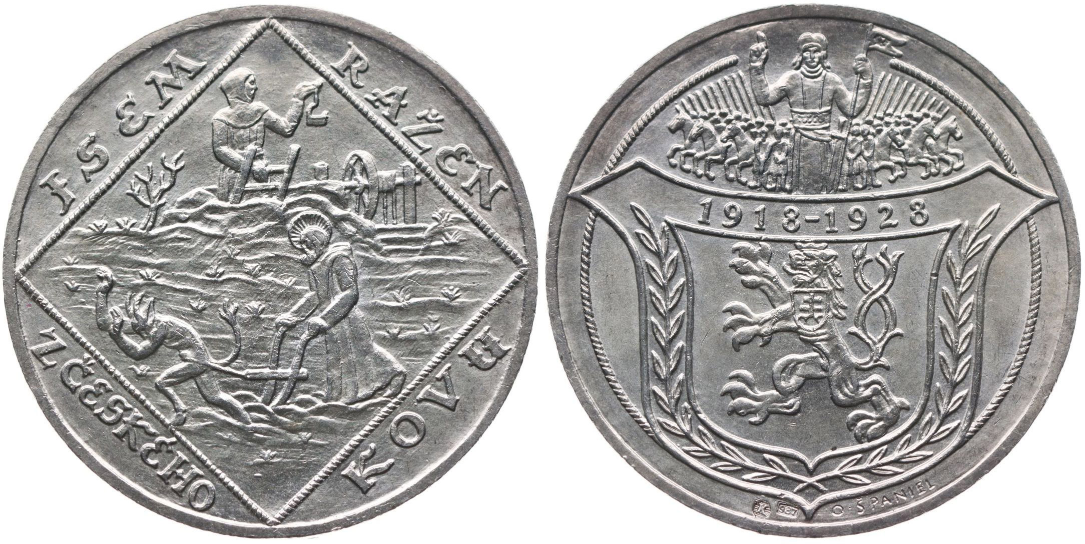 Jsem ražen z českého kovu - 10. výročí republiky 1928#Ag Sv.Prokop orá s čertem, havíř, opis / státní znak, Sv.Václav s rytíři, Sign., Punc.987, Ag 34 mm, 20.1 g