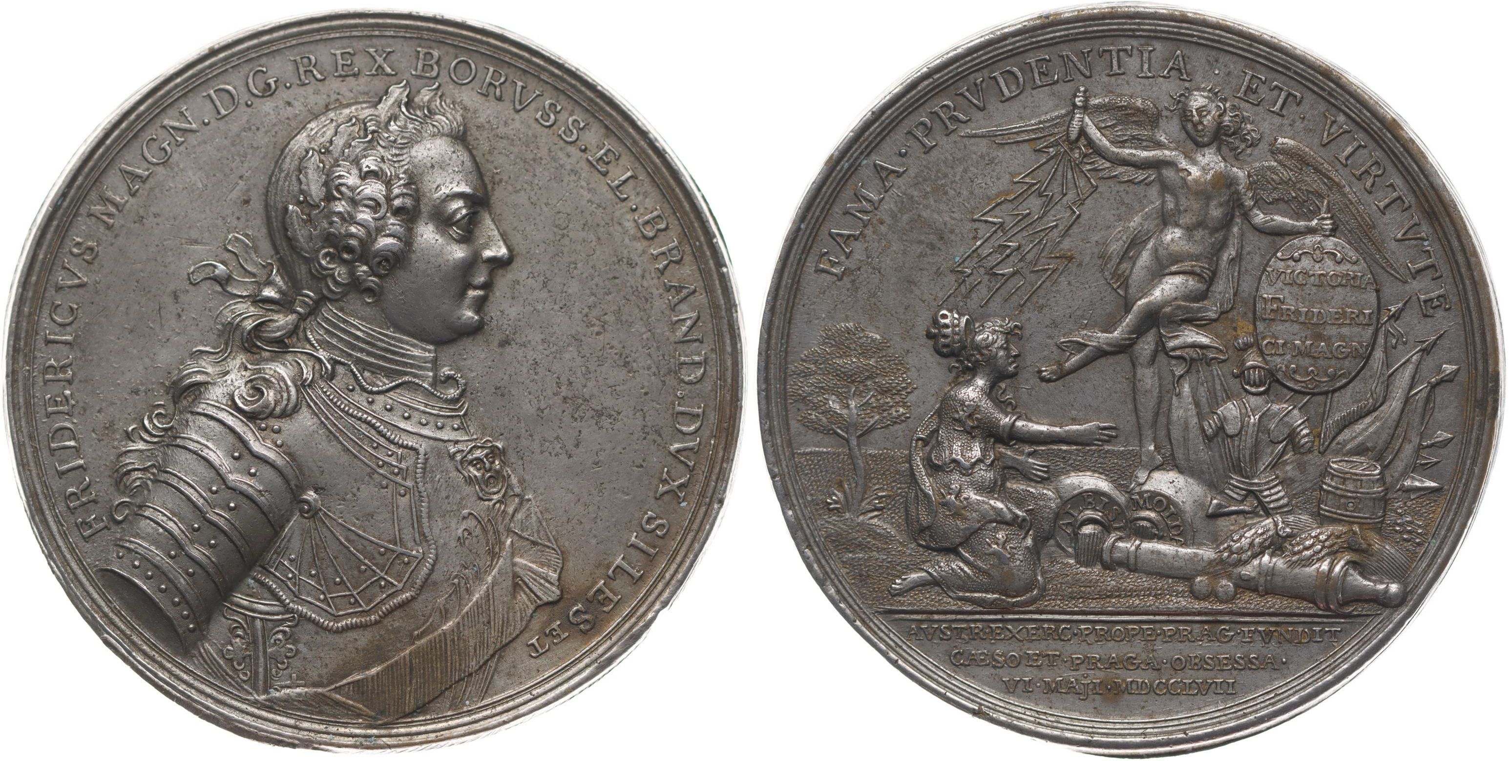 Friedrich II. - medaile na vítězství u Prahy 6.5.1757 Poprsí krále zprava, opis / Victorie pokořuje klečící Bohemii, opis Sign.J.G.Holtzhey, Postř.bronz 48 mm, Wu.2818, Do.4821, Ho.4970
