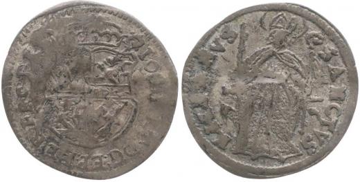 Šilink 1671, čtyřdílný znak, opis / stojící sv.Kilián, opis