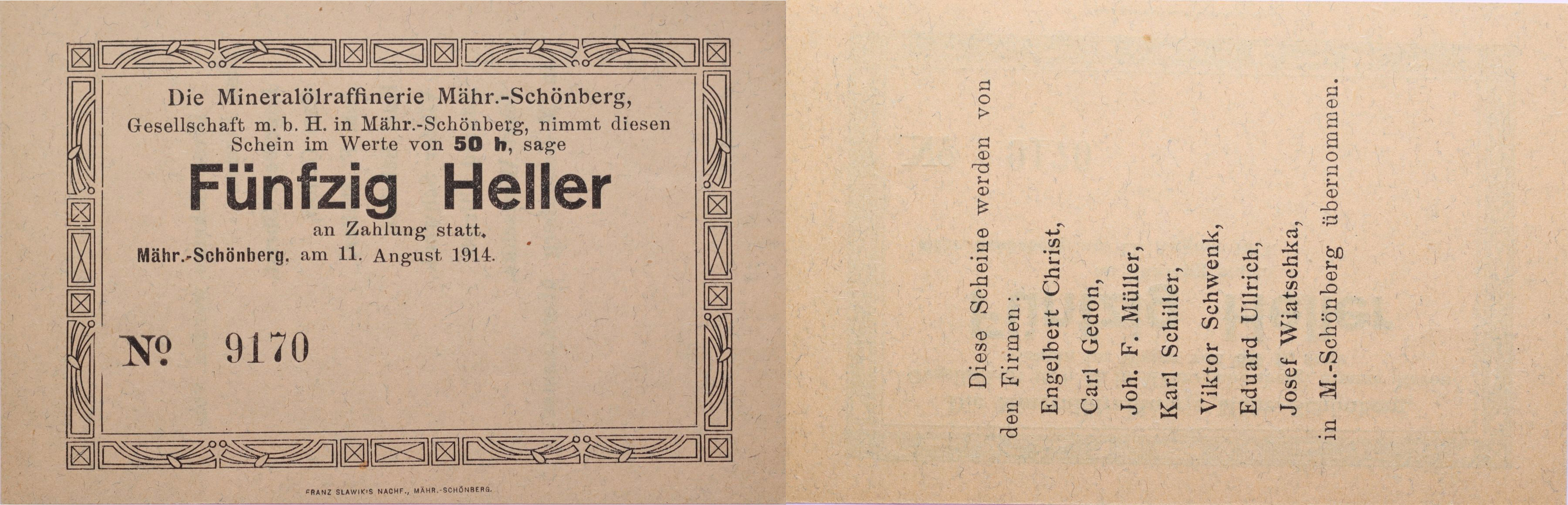 Šumperk (M.Schönberg) mineral.raf., 50 Heller 11.8.1914, č.9170 bez razítka, bez podpisu, DH.120.2.1a.n