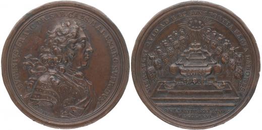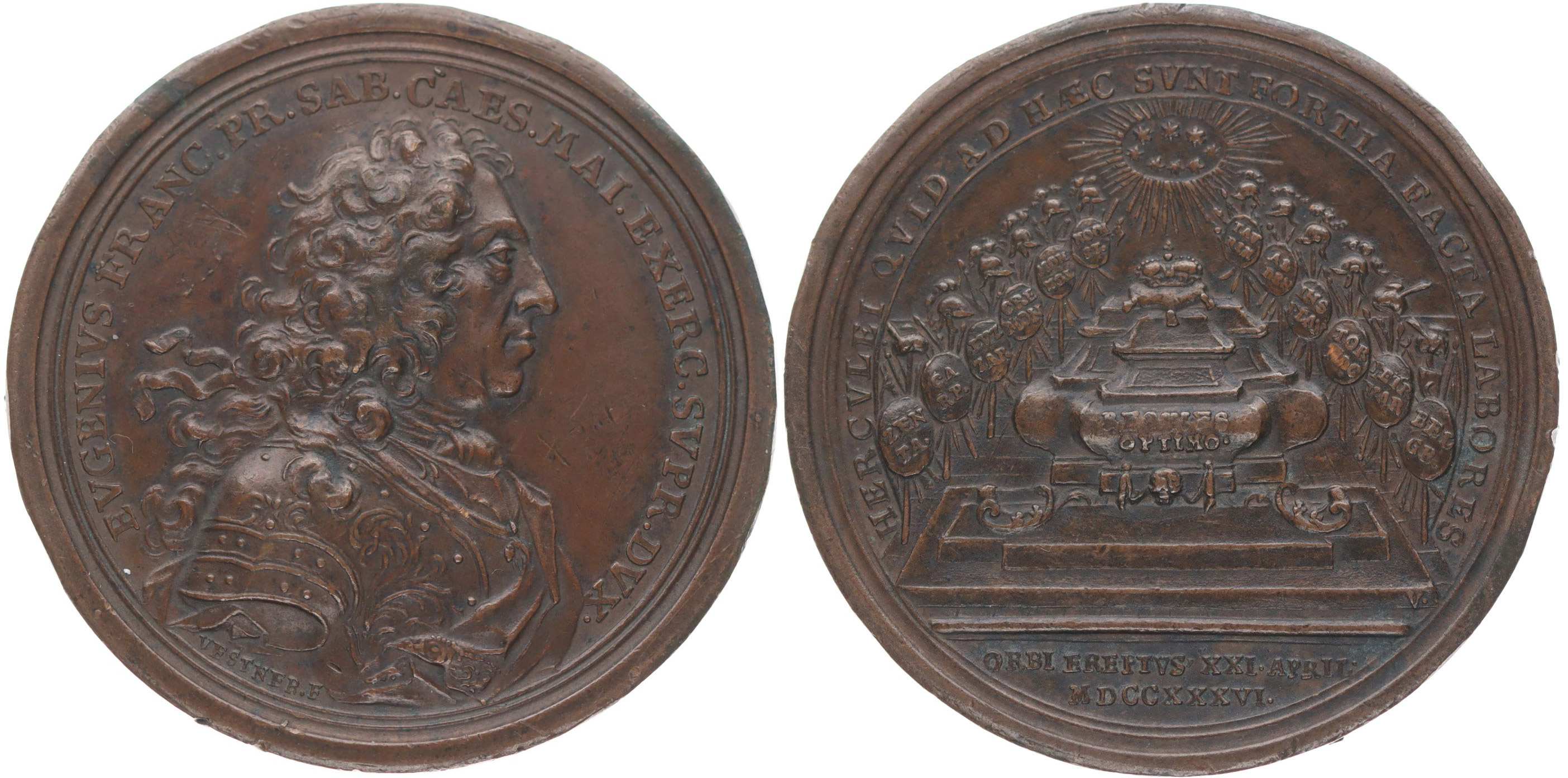 Vestner - úmrtní medaile 21.4.1736 Poprsí zprava, opis / rakev na katafalku s čestnou stráží, 2řádk.nápis v úseči, opis, Bronz 44 mm, 26,93 g, Num.Közlöny 1907, p.10, No.10_RR!