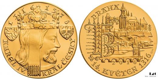 10 dukátová medaile Karel IV. 2016, raženo jen 19 ks, Au 42 mm, 34,91 g, 986/1000, sig. Kolářský, karta