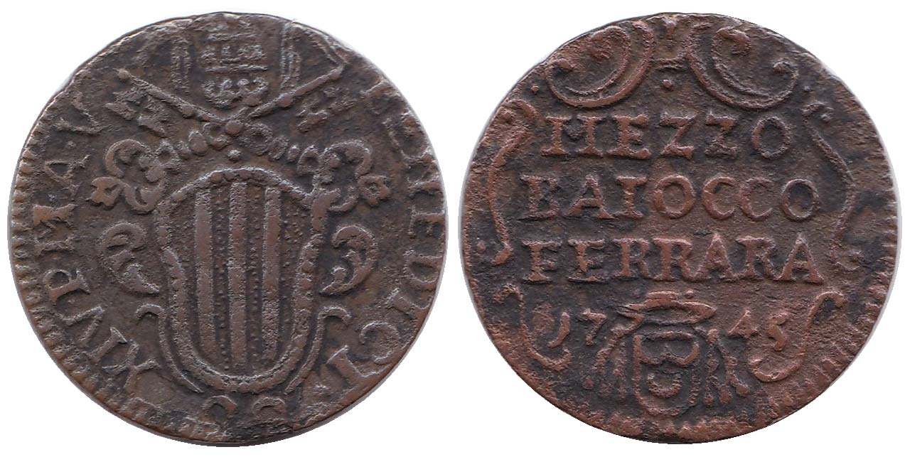 1/2 baiocco 1745, Ferrara, nápis v kartuši, Berman 2838