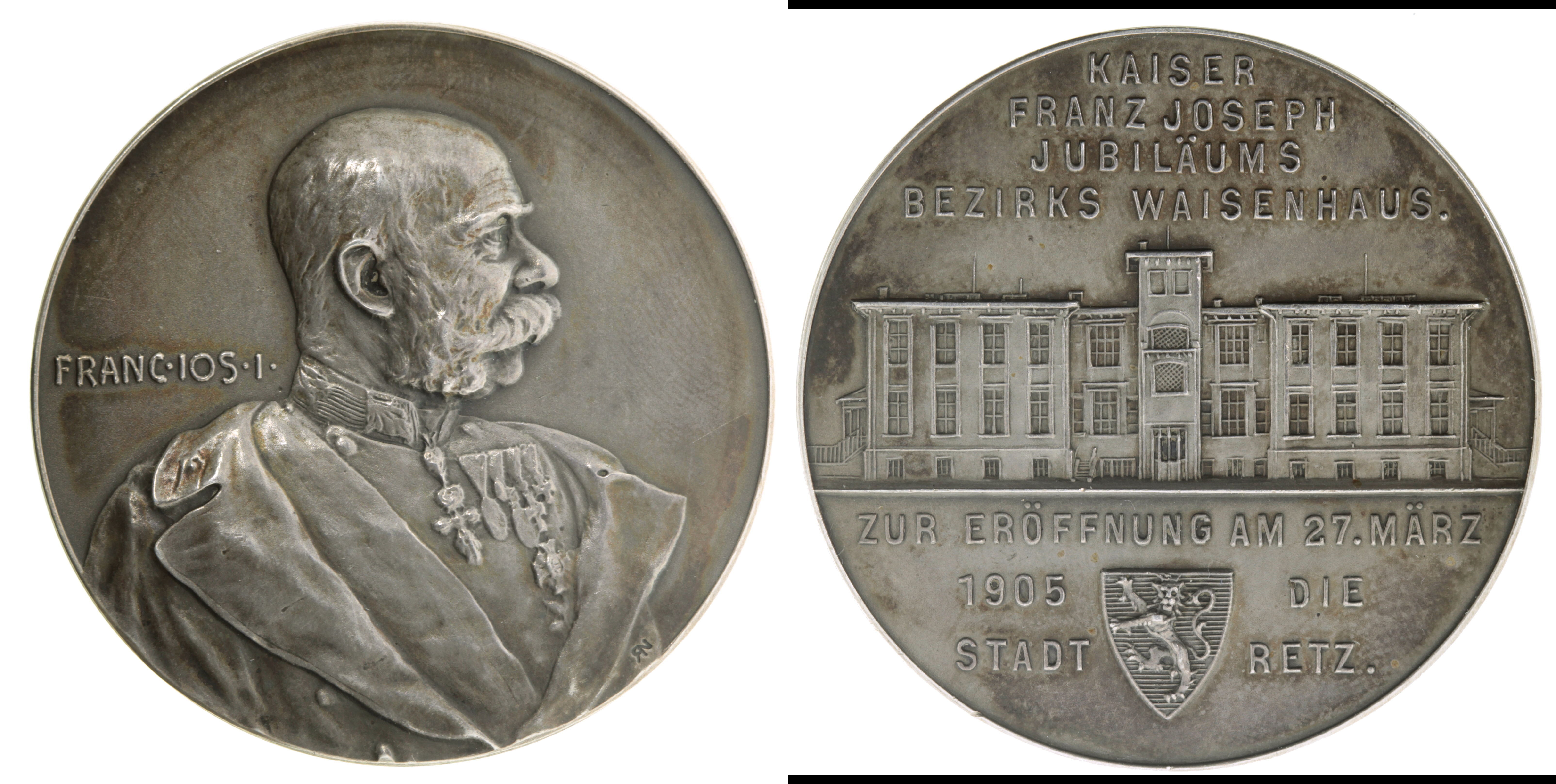 Neuberger a Schwerdtner, Ag medaile 1905, okresní sirotčinec v Retzu, 37,5 mm/21,05 g, poprsí z prava / budova a nápis, patina R