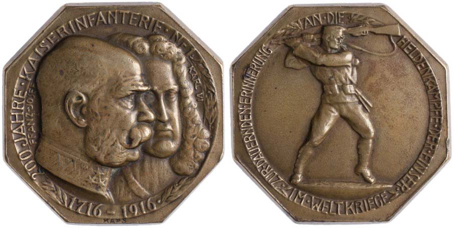 Opava, FJI a Karel VI., medaile na 200. výročí 1. pěšího pluku v Opavě 1716-1916, osmihranná medaile bronz 49x50mm/59,7g, hlavy císařů, rv: rakouský voják