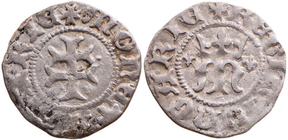 denár kříž/korunované M, Huszár 566, dvě lilie, u kříže tečka vlevo dole