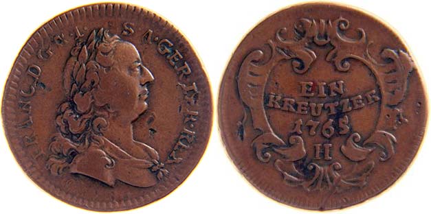 1 krejcar 1765 H Hall, dr.vrypy