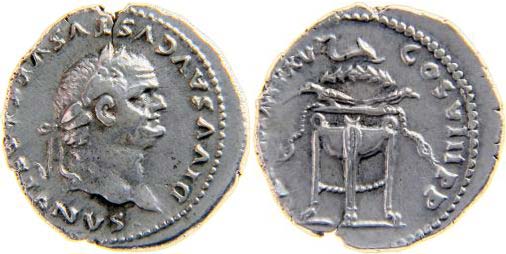 denár, DIVVS AVGVSTVS VESPASIANVS, rv: delfín nad trojnožkou, dr.exc.