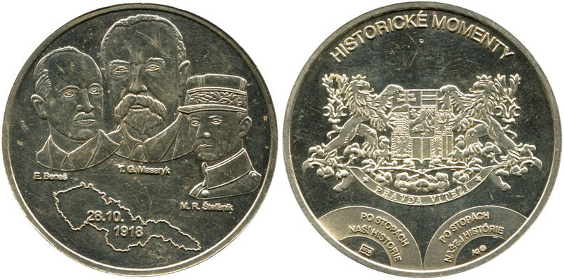 Historické momenty - vznik ČSR 28.X.1918 - portréty Masaryka, Beneše a Štefánika nad mapou, Ag 0.333 (15 g) 35 mm, vlas.škr.