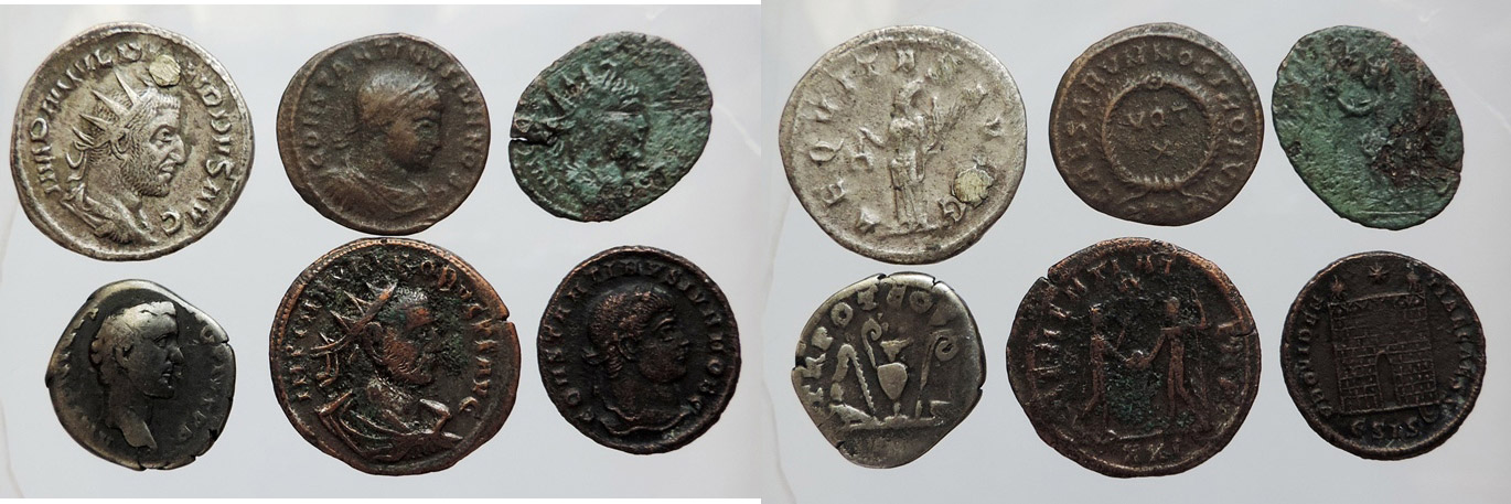 Antonius Pius, AR denár okrájený (-1/2), Philippus I. AR antoninian, zapr.dírka (1/2), Probus AE antoninian (-2/2-), Constantin I. AE 18mm táborová brána (1/1) + 2 další ks stav 3/3 celkem 6ks