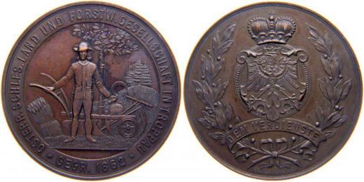 Opava 1862, J.Christelbauer, Slezská zemědělská a lesnická společnost v Opavě, Bz 52mm, postava hospodáře s atributy, německý opis / Dem Verdienste, korunovaný erb, patina