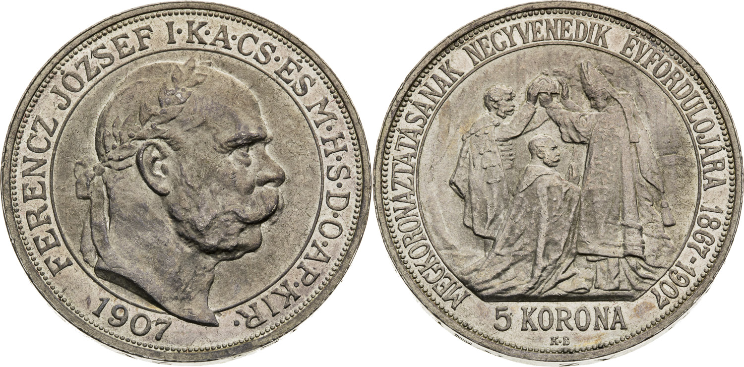 5 Korona 1907, 40. výročí korunovace Františka Josefa I. na uherského krále v Budapešti, Kremnica, 24 g, 36,236 mm, Ag, Frühwald 2194, Huszár 2214, Novotný 158,