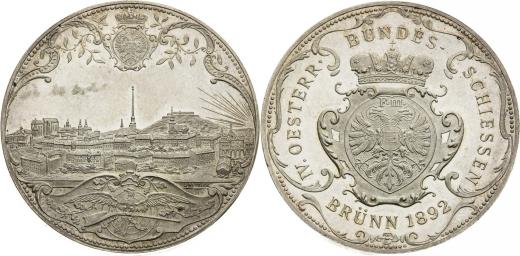 Stříbrná medaile 1892, IV. rakouská spolková střelecká soutěž v Brně, Viedeň, 22,9 g, 36,2 mm, Ag, R! Vzácný!, Frühwald 2187, Austria (2018) I., Valovič FJ 166,