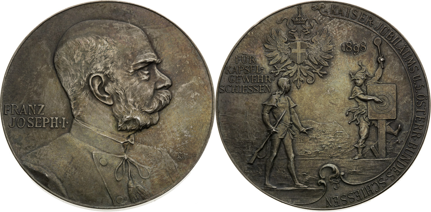 Stříbrná medaile 1898, V. rakouská spolková střelecká soutěž ve Vídni, Viedeň, A. Scharff, 25 g, 37,2 mm, Ag, Frühwald 2191, Austria (2018) II C., Hauser 5215,