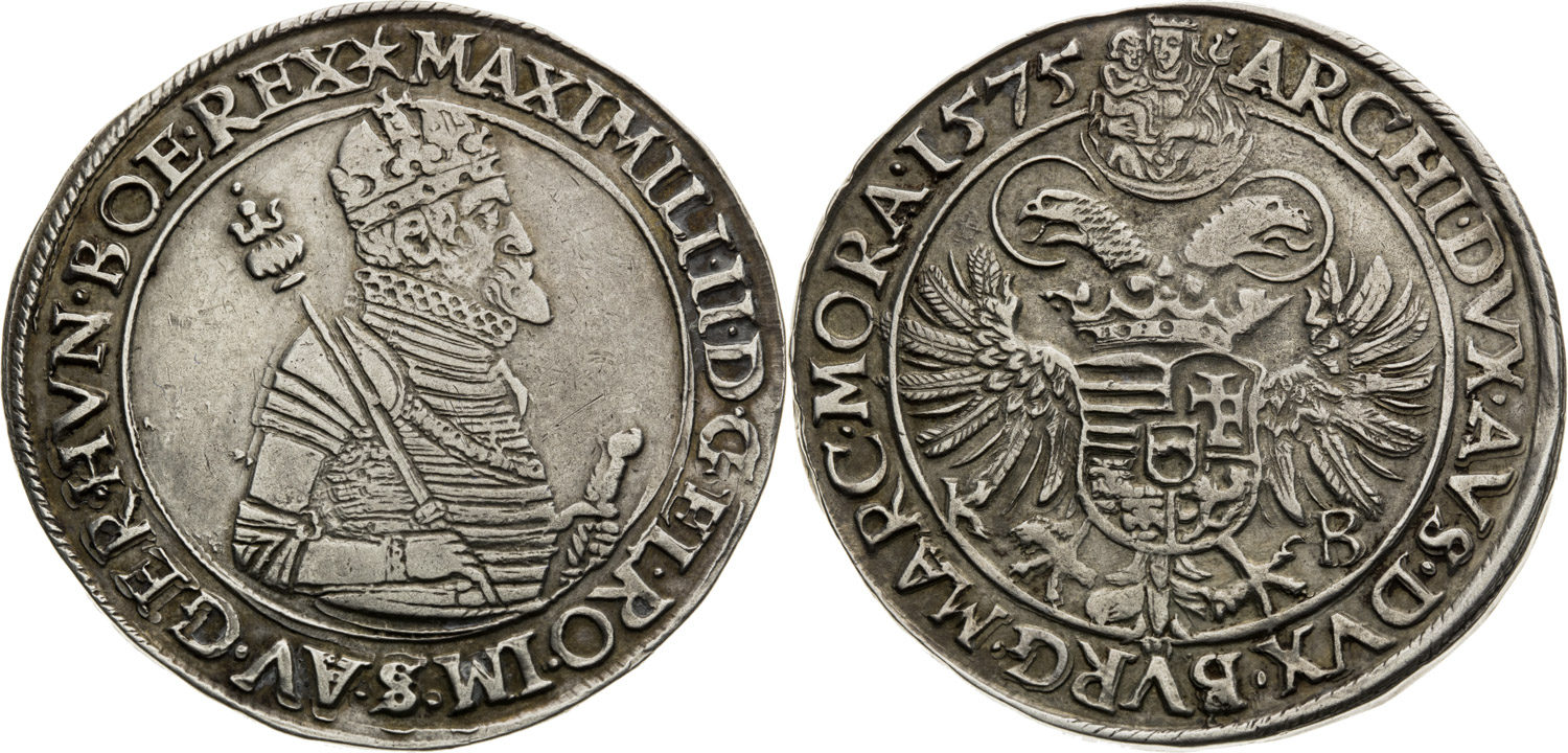 Maxmilián II. Tolar 1575, Kremnica, 28,66 g, 40-42 mm, Ag , Huszár 978/979, Unger II. ako 758, Voglhuber 67/I,