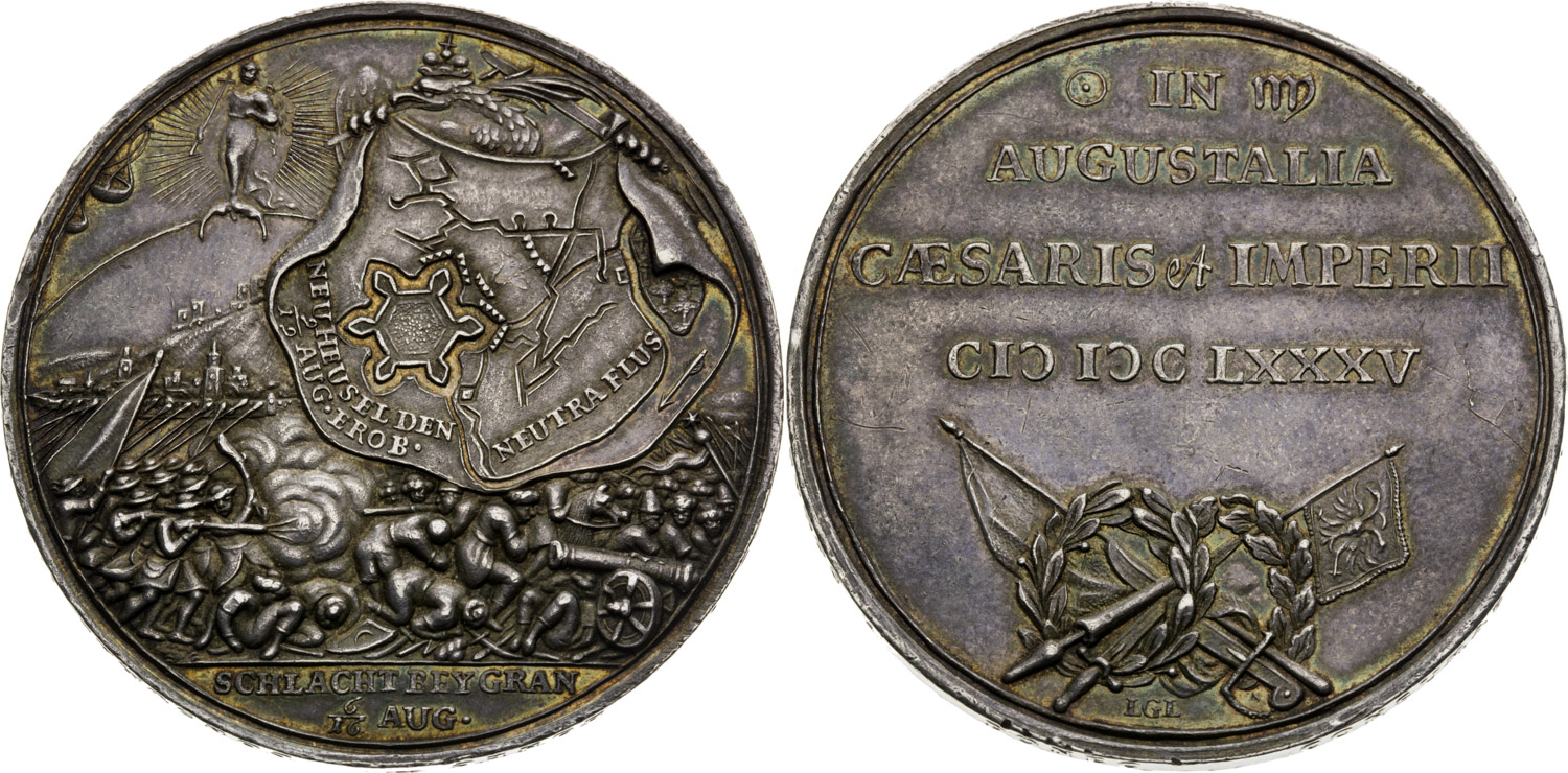 Leopold I. Stříbrná medaile 1685, Dobytí Ostřihomu a Nových Zámků, Norimberg, L. G. Lauffer, 22,12 g, 39,96 mm, Ag, Erlanger 2569, Montenuovo 960, Pěkná patina.