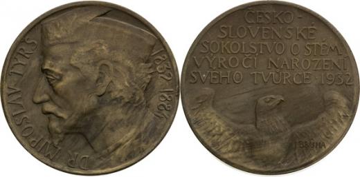 Bronzová medaile 1932, Dr. Miroslav Tyrš. K výročí narození zakladatele Tělocvičné jednoty Sokol, Kremnica, Jaroslav Brůha, 29,59 g, 42 mm, Bronz (Bronze), M&CH CSR1-MED7, Novotný IV.C,
