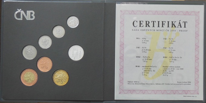 Sada oběhových mincí v pův. etui - ročník 2004 semiš, 50h - 50Kč, stříbrná medaile s motivem 20 Kč - vzor 2000 (4.000 ks)
