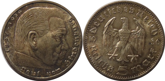 5 Mark 1936 A - Hindenburg, KM.86, Ag 13,88g(900/1000), patina