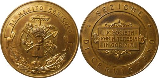 Medaile - Za zásluhy v zemědělství, Teresiánská zeměděl. společnost v Gorizii, poč. XX.stol, Sign. H.U.W , bronz, pr 50mm,