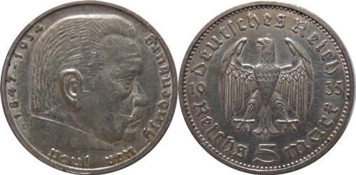 5 Mark 1935 E - Hindenburg, KM.86, Ag 13,88g(900/1000), dr škr v ploše
