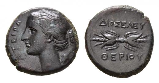 Sicily, Syracuse Bronze circa 317-289, Æ 20.5mm., 7.10g. ΣΩTEIPA Head of Artemis left; over left shoulder, quiver. Rev. ΔIOΣ EΛEYΘEPIOY Winged thunderbolt. SNG ANS 746. SNG Cop. 784. Calciati 147.Green patina and good very fine.This coin is Not subject to any kind of US import restrictions.