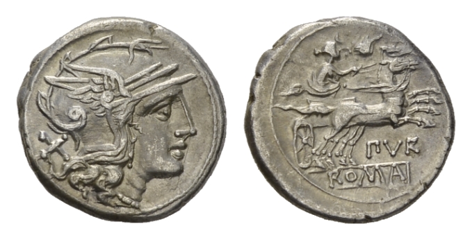 Furius Purpurio. Denarius circa 169-158, AR 18mm., 3.63g. Helmeted head of Roma right; behind, X. Rev. Luna in biga right; above, murex-shell and below, PVR ligate and ROMA in partial tablet. Babelon Furia 13. Sydenham 424. Crawford 187/1.Good very fine.