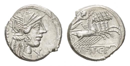 M. Fannius C.f. Denarius circa 123, AR 18mm., 3.72g. Helmeted head of Roma right; behind, ROMA and below chin, X. Rev. Victory, holding wreath, in prancing biga r.; in exergue, M·FAN C·F. Babelon Fannia 1. Sydenham 419. Crawford 275/1.