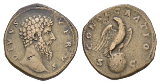 Lucius Verus, 161-169 Sestertius circa 169, Æ 32mm., 24.07g. DIVVS VERVS Bare head right. Rev. CONSECRATIO Eagle on globe standing left. C 56. RIC M. Aurelius 1509.