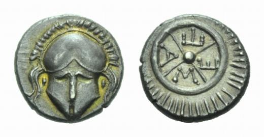 Thrace, Mesembria Diobol 450-350, AR 11mm., 1.30g. Corinthian helmet. Rev. Radiate wheel of four spokes; within, M-E-T-A. SNG BM Black Sea 268. SNG Cop. 652.