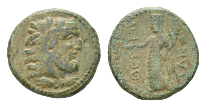Sicily, Himera as Thermae Himerenses Bronze after 252, Æ 19.5mm., 5.38g. Head of Heracles, wearing lion skin. Rev. Turreted female figure, holding patera and cornucopiae. Calciati 20.