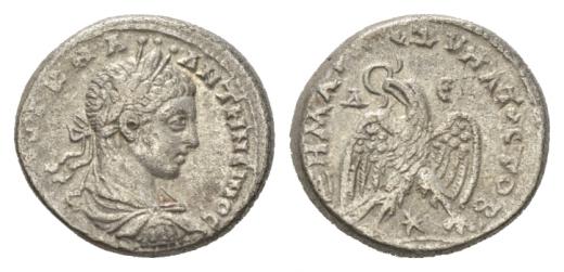 Elagabalus, 218-222 Tetradrachm Antioch, AR 26mm., 15.1g. Laureate, draped, and cuirassed bust right. Rev. Eagle standing facing, head and tail left, with wings spread, holding wreath in beak; star between legs. Prieur 272.