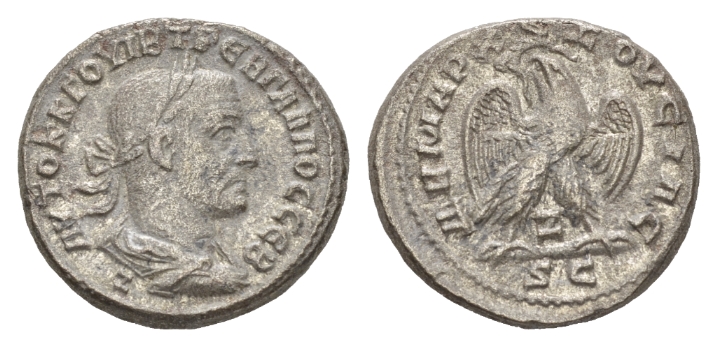 Trebonianus Gallus, 251-253 Tetradrachm Antioch circa Antioch, AR 26mm., 11.1g. Laureate, draped, and cuirassed bust right, seen from behind; Z below. REV. Eagle standing left, head right, holding wreath in beak; Z between legs. Prieur 670a.