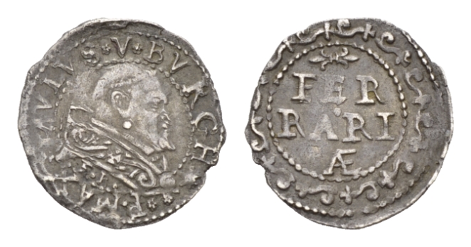 papal coinage, Paul V, Camillo Borghese Half Grosso Ferrara, AR 16.5mm., 0.8g. Bust right wearing stole. REV. FER/RARI/AE within wreath. Munt.222.