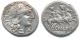Denár, hlava Romy, před ní X, za ní TRIO / Dioskurové na koních z prava CN. LVXR / ROMA Seaby 1; Syd. 450