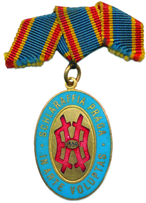 Praha - SCHLARAFFIA PRAGA . IN ARTE VOLUPTAS . , ve znaku datace 1559 (=1859) bronz.tříbarevný smalt.ovál 26x36 mm orig.ouško +tříbarev. dámská stužka ražebna:A.Porges Prag