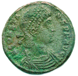 AE 24, císař stojí na galéře drží Fénixe na globu a korouhev s ch ristogramem, na zádi sedí Viktorie s kotvou FEL TEMP REPARATI O minc. Thessalonica (TESA) RIC VIII 110