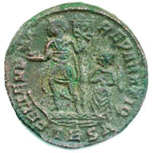 AE 24, císař stojí na galéře drží Fénixe na globu a korouhev s ch ristogramem, na zádi sedí Viktorie s kotvou FEL TEMP REPARATI O minc. Thessalonica (TESA) RIC VIII 110