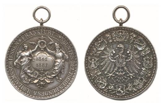 Frankfurt n.M. - IX. německé spolkové a jubilejní střelby 1862-18 87 / císařský orel a kolem osm štítů / Germania a střelec drží oz dobný rámeček s datací sign.: LAUER Ag 40 mm orig. ouško+závěs