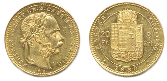 8 Forint = 20 Franken 1880 KB, nový model hlavy