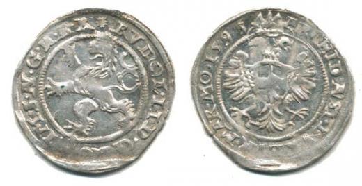 Bílý groš 1595, K.Hora-Herold jako MKČ 376, ale hlavy v kroužc ích, opis: MAR. MO._mělčí ražba, jinak