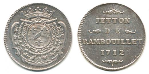 "Jeton de Rambouillet 1712" Čtyř řádkový nápis a arabesky / Zdobe ný korunov. burbonský znak Ag 28 mm 7,13 g
