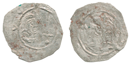 Denár - poprsí zprava, před sebou drží meč / anděl zleva klečící před palmovým stromem, před sebou drží prapor nález Ladná (z doby 2. křížové výpravy v letech 1147-48) PV 239 "RR"_nedor.