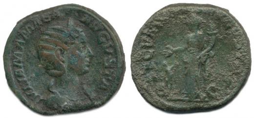 Sestertius, sedící Fecunditas mezi S C drží roh hojnosti, u nohou dítě FECVNDITAS AVGVSTAE RIC 668; Sear 8226