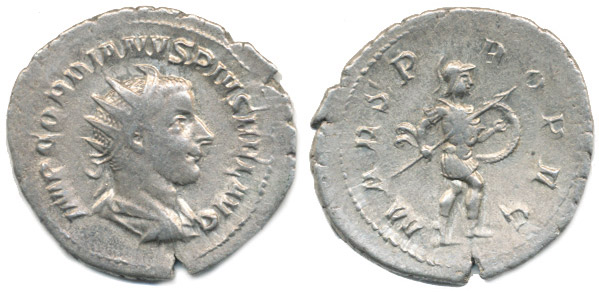 Antoninián, kráč.Mars zprava ve zbroji nese kopí a štít MARS PROPVG RIC 145; Sear 8623