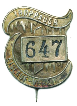 Opava - Členský odznak "Troppauer eislauf-verein" (bruslařský klu b), uprostřed ve štítku číslo 647, nahoře a dole ve stuhách nápis postř. plech 24x27 mm zapín. spona