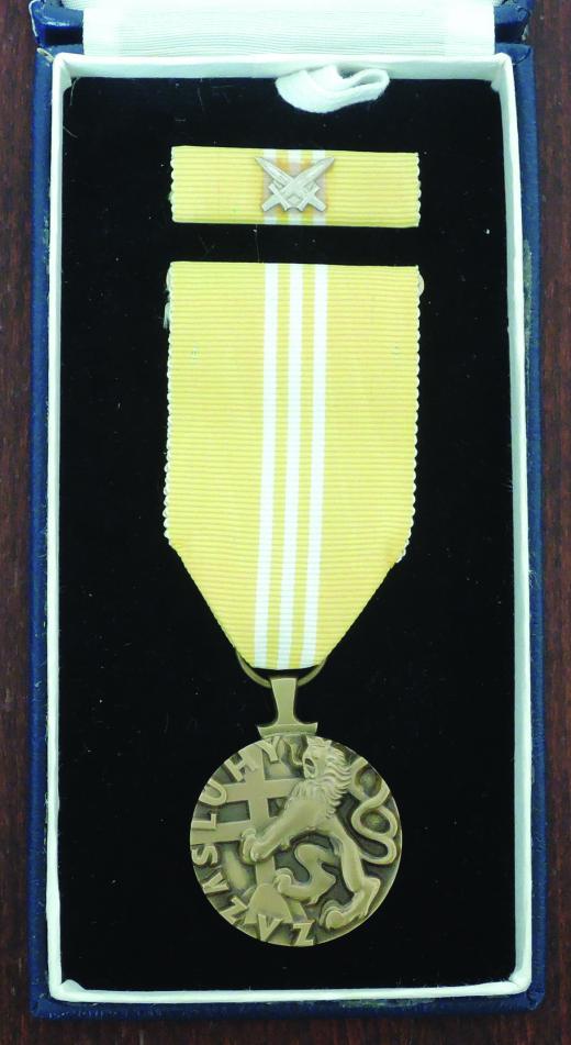 Medaile "Za zásluhy" III. stupeň bronz +malá stužka s meči Nov. 198c orig. etue